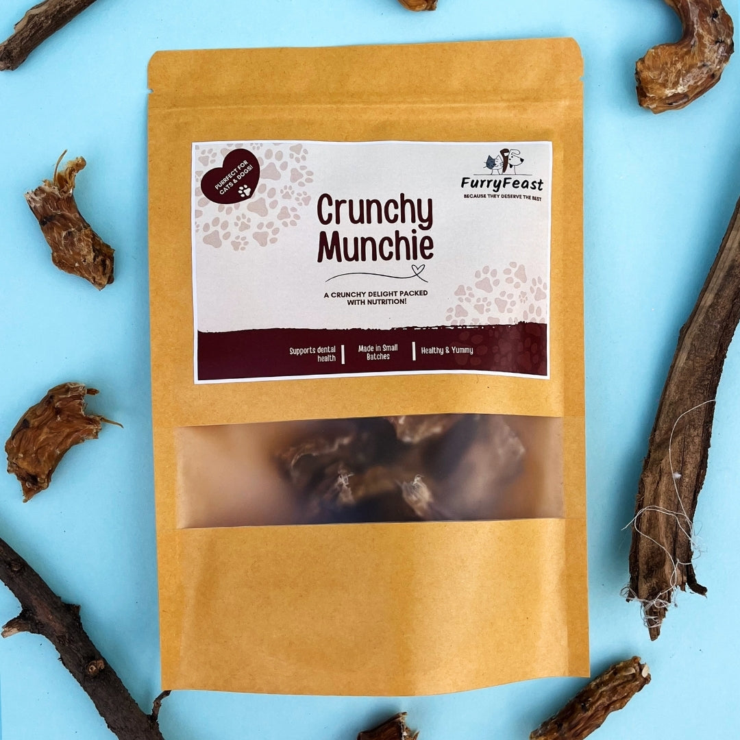 Crunchie Munchie treats offer more than just a snack—they’re a health boost in every bite! Made from 100% natural chicken necks, they’re a perfect source of protein, calcium, and phosphorus, supporting strong bones, teeth, and overall vitality. These preservative-free, dehydrated treats act as a supplemental chew, promoting dental health while delivering irresistible crunchiness for dogs and cats alike.