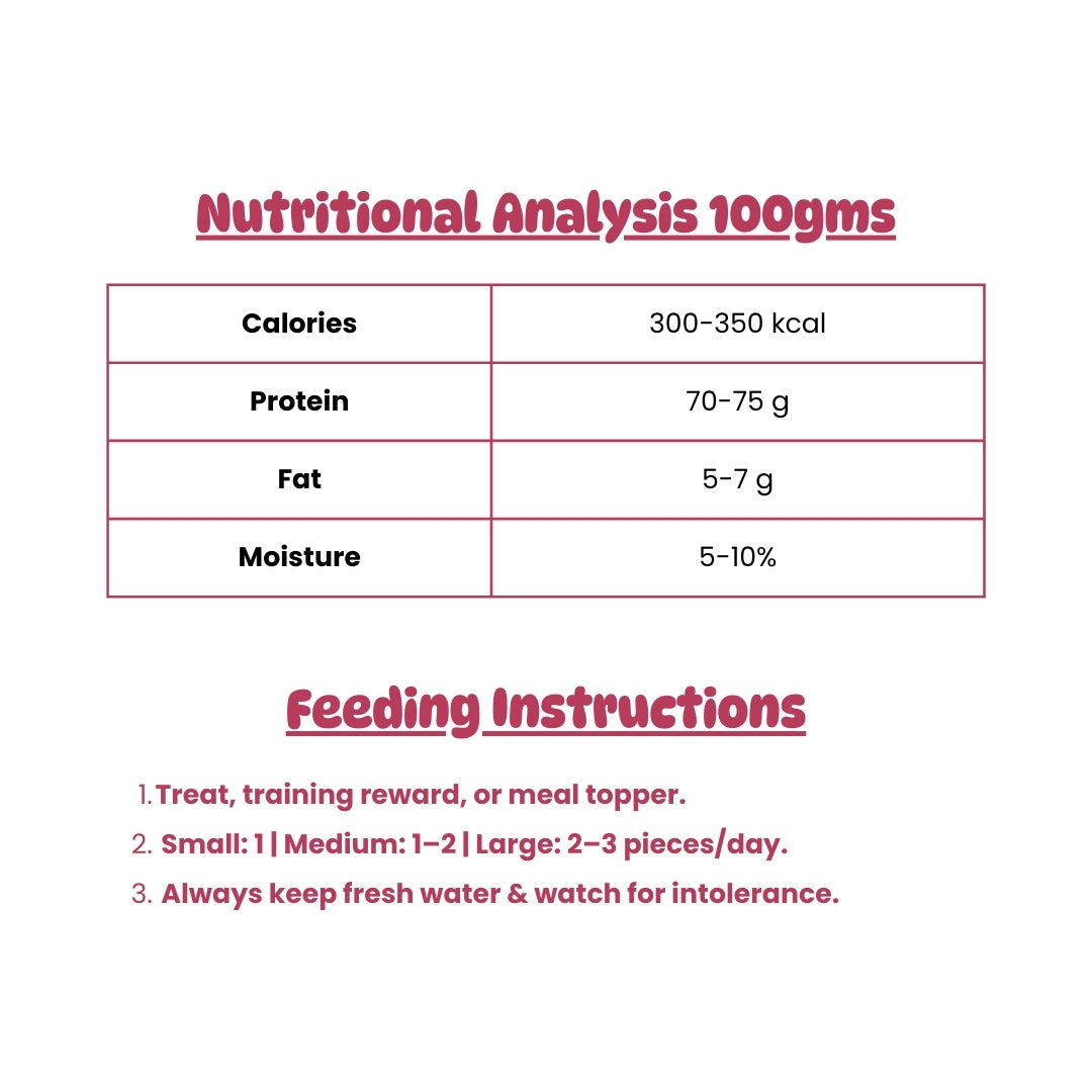 100% dehydrated chicken breast. Lean cuts, no fillers.